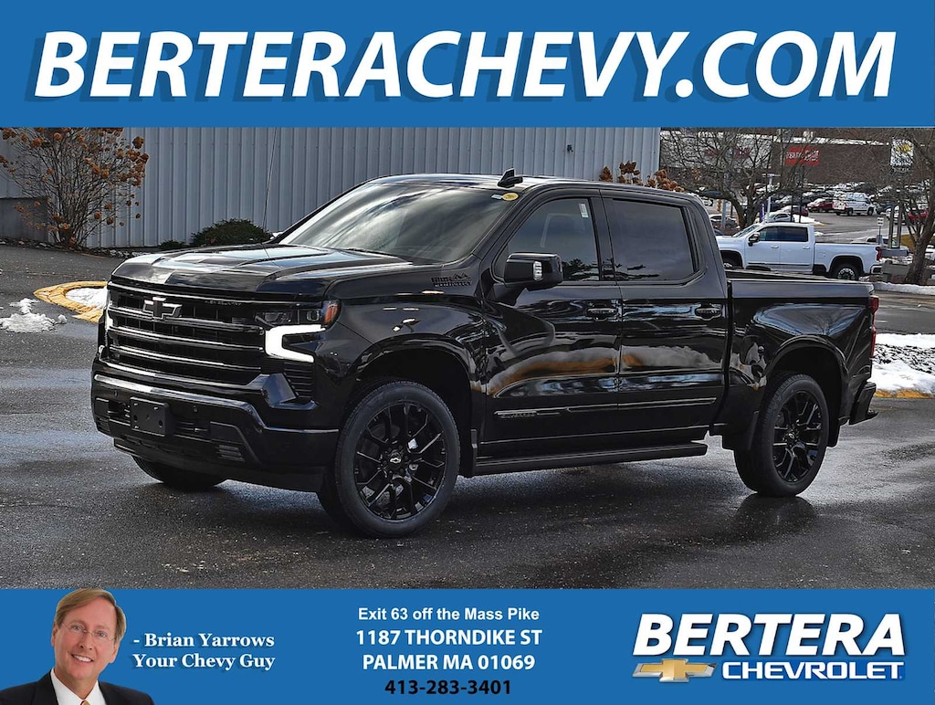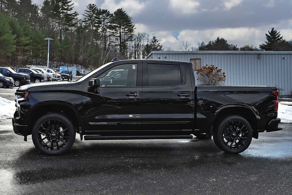 LPO, 22" (55.9 CM) HIGH GLOSS BLACK MULTI-SPOKE WHEELS LPO wheels will come with 4 steel 22" wheels from the factory with alignment specs set to 22" LPO wheel selected. Includes wheel locks. (dealer-installed), SUPER CRUISE advanced driver assistance technology, for use on compatible roads. Includes 3 years of OnStar One with Super Cruise upgrade, ENGINE, 6.2L ECOTEC3 V8 (420 hp [313 kW] @ 5600 rpm, 460 lb-ft of torque [624 Nm] @ 4100 rpm); featuring Dynamic Fuel Management that enables the engine to operate in 17 different patterns between 2 and 8 cylinders, depending on demand, to optimize power delivery and efficiency, HIGH COUNTRY PREMIUM PACKAGE includes (CF5) power sunroof, (RPT) 22" painted aluminum wheels with Chrome inserts, (XCE) 275/50R22SL all-season, blackwall tires and (RIA) floor liner, LPO, MIDNIGHT EDITION includes Black Silverado badging, Black trim level badging, (V76) Black recovery hooks and Black dual exhaust tips Includes dark headlamp bezel. Includes Black bowties (steering wheel horn pad and front grille), hood badging, grille, lower skid plate, exhaust tips, mirror caps, door handles, body side moldings, and DLO moldings. Includes (RD5) 20" High gloss Black painted aluminum wheels and (QAE) 275/60R20 all-terrain tires. Includes (B3L) Black Power Assist Steps. TECHNOLOGY PACKAGE includes (DRZ) Rear Camera Mirror and (UV6) 15" Diagonal Head-Up Display, SUSPENSION PACKAGE, ADAPTIVE RIDE CONTROL, TAILGATE, MULTI-FLEX with six functional load/access features, NOTE: Auto release can be disabled if ball hitch is installed. See Owner's manual for details, AUDIO SYSTEM, CHEVROLET INFOTAINMENT 3 PREMIUM SYSTEM with Google built-in compatibility (select service plan required, terms and limitations apply) including navigation capability, 13.4" diagonal HD color touchscreen, includes multi-touch display, AM/FM stereo, Bluetooth® streaming audio for music and most phones; featuring Wireless Apple CarPlay® and Wireless Android Auto® capability for compatible phones, advanced voice recognition, in-vehicle apps, personalized profiles for infotainment and vehicle settings (STD), TRANSMISSION, 10-SPEED AUTOMATIC with Electronic Transmission Range Selector, (ETRS), electronically controlled with overdrive, tow/haul mode and steering column paddle shifters. Includes Cruise Grade Braking and Powertrain Grade Braking (STD). Chevrolet High Country with Black exterior and Jet Black interior features a 8 Cylinder Engine with 420 HP at 5600 RPM*.