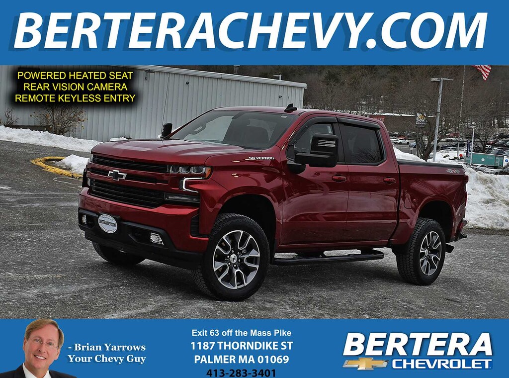 **ONE OWNER/CLEAN CARFAX** 5.3 L, V8 EcoTec ($1,395), 4x4 Crew Cab RST, Cherry Red Tintcoat ($495), 20" Painted Alunimum Wheels with Machine Face and Argent Metallic Pockets ($800), Bed Protection Package ($685): Chevy-Tec Spray on Bed Liner, Powered Heated Seats, Seat Rear 60/40 Folding Bench (Folds Up), 3-Passenger, Audio System: 6 Speaker System, Chevrolet Infotainment 3 System 8" Diagonal Color Touchscreen, AM/FM Stereo, Dual-Zone Automatic Climate Control, Rear Vision Camera, Trailer Brake Controller ($275), Trailering Package: Trailer Hitch, 7-Pin And 4-Pin Connectors And Hitch Guidance, LED Headlamp/Tail LAMPS/Fog Lamps, Mirrors: Outside Heated Power-Adjustable, Leather Wrapped Heated Steering Wheel/Manual Tilt/Telescoping Steering Column, Auto-Locking Rear Differential, Electronically Controlled With Overdrive And Tow/Haul Mode, Cruise Grade Braking And Powertrain Grade Braking, Stability Control System With Proactive Roll Avoidance And Traction Control, Electronic Trailer Sway Control, Hill Start Assist, Tailgate: Gate Function Manual With Ez Lift Includes Power Lock And Release, Meticulously Maintained New Car Trade-In, Fully Serviced and Warrantied! Loaded with Power Options and So Much More. ======KEY FEATURES INCLUDE: 4x4, Rear Air, Heated Driver Seat, Back-Up Camera, Satellite Radio, Onboard Communications System, Trailer Hitch, Remote Engine Start, Dual Zone A/C, WiFi Hotspot, Heated Seats. Keyless Entry, Privacy Glass, Steering Wheel Controls, Heated Mirrors, Alarm. ======OPTION PACKAGES: ENGINE, 5.3L ECOTEC3 V8 (355 hp [265 kW] @ 5600 rpm, 383 lb-ft of torque [518 Nm] @ 4100 rpm); featuring available Dynamic Fuel Management that enables the engine to operate in 17 different patterns between 2 and 8 cylinders, depending on demand, to optimize power delivery and efficiency (NOTE: Certain 21MY vehicles will include (YK9) Not Equipped with Dynamic Fuel Management.), WHEELS, 20" X 9" (50.8 CM X 22.9 CM) PAINTED ALUMINUM with machine face and Argent Metallic pockets, BED PROTECTION PACKAGE includes (B1J) wheel house liners and (CGN) Chevytec spray-on bedliner, AUDIO SYSTEM, CHEVROLET INFOTAINMENT 3 SYSTEM 8" diagonal color touchscreen, AM/FM stereo. Additional features for compatible phones include: Bluetooth audio streaming for 2 active devices, voice command pass-through to phone, wired Apple CarPlay and Android Auto capable. (STD), TRANSMISSION, 8-SPEED AUTOMATIC, ELECTRONICALLY CONTROLLED with overdrive and tow/haul mode. Includes Cruise Grade Braking and Powertrain Grade Braking (STD). Chevrolet RST with Cherry Red Tintcoat exterior and Jet Black interior features a 8 Cylinder Engine with 310 HP at 5600 RPM*. ======EXPERTS RAVE: Great Gas Mileage: 21 MPG Hwy. ======AFFORDABILITY: This Silverado 1500 is priced $2,600 below J.D. Power Retail. Approx. Original Base Sticker Price: $46,000*. ======PURCHASE WITH CONFIDENCE: CARFAX 1-Owner ======WHY BERTERA CHEVROLET?: From Acuras to Volvos and every make in between, be amazed by what you can afford! At Bertera Chevy you should expect the cleanest, best equipped vehicles from Acura to Volvo at the best values, everyday. It's not just dollars and cents. its common sense! Not all used vehicles are the same. When you look at a pre-owned vehicle at Bertera Chevrolet, we want you to have higher expectations. We employ a team of full time buyers that search the entire country for the best value vehicles, not just the lowest priced vehicles. We want you to expect a better condition. Expect more equipment. Expect more pre-delivery servicing. Expect a clean CarFax report. Expect the Free Tires for Life Program. Expect more. For 12 years and running, Bertera Chevrolet has been fulfilling and exceeding your expectations. We look forward to serving you. Pricing analysis performed on 2/20/2026. Horsepower calculations based on trim engine configuration. Fuel economy calculations based on original manufacturer data for trim engine configuration. Please confirm the accura