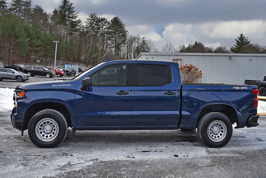 WT CONVENIENCE PACKAGE includes (AKO) tinted windows, (C49) rear-window defogger, (K34) cruise control and (DLF) power mirrors, CHEVYTEC SPRAY-ON BEDLINER, BLACK WITH CHEVROLET LOGO (does not include spray-on liner on tailgate due to Black composite inner panel), AUTO-LOCKING REAR DIFFERENTIAL, GLASS, DEEP-TINTED, MIRRORS, OUTSIDE HEATED POWER-ADJUSTABLE When (PQA) WT Safety Package is ordered, includes (DP6) high gloss Black mirror caps.), AUDIO SYSTEM, CHEVROLET INFOTAINMENT 3 SYSTEM 7" diagonal color touchscreen, AM/FM stereo. Additional features for compatible phones include: Bluetooth® audio streaming for 2 active devices, voice command pass-through to phone, wired Apple CarPlay® and Android Auto® capable. (STD), ENGINE, 2.7L TURBO HIGH-OUTPUT (310 hp [231 kW] @ 5600 rpm, 430 lb-ft of torque [583 Nm] @ 3000 rpm) (STD), TRANSMISSION, 8-SPEED AUTOMATIC, ELECTRONICALLY CONTROLLED with overdrive and tow/haul mode. Includes Cruise Grade Braking and Powertrain Grade Braking (STD). Chevrolet Work Truck with Northsky Blue Metallic exterior and Jet Black interior features a 4 Cylinder Engine with 310 HP at 5600 RPM*.