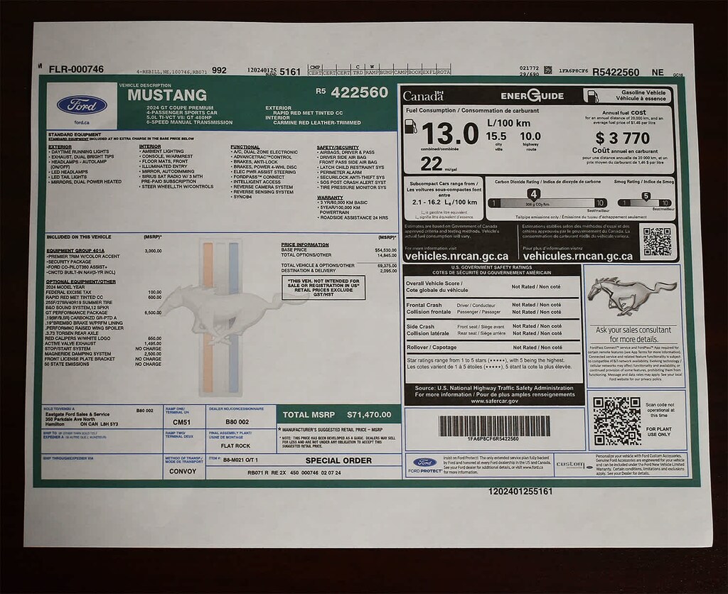 GT PERFORMANCE PACKAGE K-brace and accent stitched center console lid, Electric Hand-Operated Parking Brake (Drift Brake), Heavy-Duty Front Springs, Performance Raised Rear Wing, Body color, Wheels: 19" x 9" Fr/19" x 9.5" Rr Carbonized, Gray-painted aluminum, Black Painted Strut-Tower Brace, Front Towing Hooks, Ebony Black Grille, ice white front and rear pony badge, 3.73 TORSEN Limited-Slip Rear Axle Ratio, Unique Stability Control, EPAS and ABS tuning, 19" Branded Brake System w/Performance Linings, black brake calipers w/white logo, Tire Repair Kit, Red Painted Brake Calipers w/White Logo, Upsized Rear Sway Bars, Tires: 255/40R19 Fr & 275/40R19 Rr Summer-Only, Designed to optimize driving dynamics and provide superior performance on wet and dry roads, High performance summer tires wear, EQUIPMENT GROUP 401A HIGH PACKAGE Premier Trim w/Color Accent Group, accent stitched center console lid, wrapped knee bolsters w/accent stitch and shifter boot, leather-wrapped steering wheel, 5-piece w/chrome bezel, unique color-accented door-trim, wrapped center console w/accent stitch, Premium Floor Mats w/Metal Gray Accent Stitch, Seat Belt w/Color Accent, Illuminated Door-Sill Scuff Plates, Security Package, Active Anti-Theft System, Locking Center Console, Wheel Locking Kit, B&O Sound System by Bang & Olufsen, 12 speakers and subwoofer in-trunk, Ford Co-Pilot360 Assist+, Pre-Collision Assist w/Automatic Emergency Braking, Evasive Steering Assist, Connected Built-In Navigation, Navigation services require SYNC®4 and FordPass Connect (optional on select vehicles), complimentary connect, MAGNERIDE DAMPING SYSTEM, ENGINE: 5.0L TI-VCT V8 stop/start system and Port Fueled Direct Injection (PFDI) (STD). Approx. Original Base Sticker Price: $60,000*.