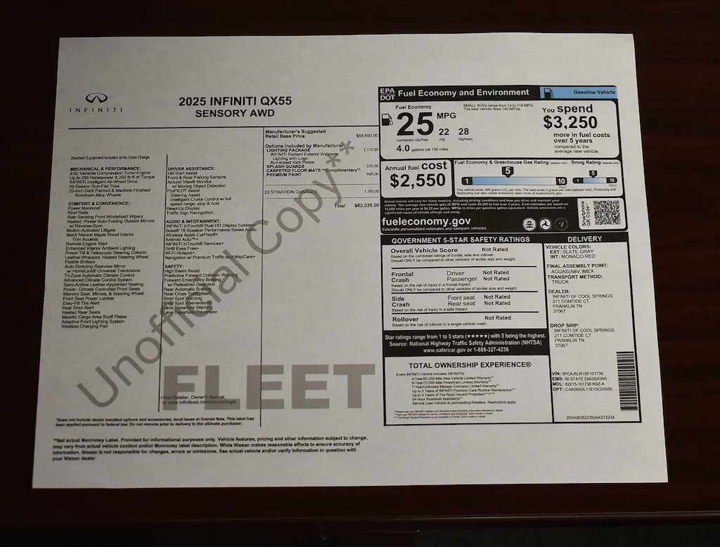 Leather Seats, Navigation, Sunroof, Power Liftgate, Rear Air, Heated Driver Seat, Heated Rear Seat, Cooled Driver Seat, Back-Up Camera, Premium Sound System, Satellite Radio, iPod/MP3 Input, Onboard Communications System, Remote Engine Start, Dual Zone A/C. Rear Spoiler, MP3 Player, Remote Trunk Release, Privacy Glass, Keyless Entry. INFINITI SENSORY with Slate Gray exterior and Monaco Red interior features a 4 Cylinder Engine with 268 HP at 5600 RPM*. Manager Special