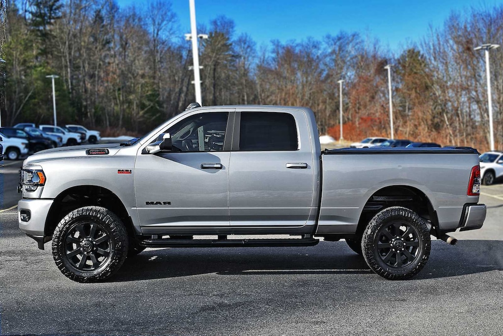 NIGHT EDITION Black Ram Head Tailgate Badge, Wheels: 20" x 8.0" Black Painted Aluminum, Black Wheel Center Hub, Black Headlamp Bezels, Painted Front Bumper, Painted Rear Bumper, Tires: LT285/60R20E OWL On/Off Road, Black Exterior Truck Badging, Gloss Black Grille Billets/Accents, Body Color Grille Surround, Black Interior Accents, Black Tail Lamp Bezels, ParkSense Front/Rear Park Assist System, LEVEL 1 EQUIPMENT GROUP Radio: Uconnect 4 w/8.4" Display, Google Android Auto®, SiriusXM Satellite Radio, Integrated Center Stack Radio, 8.4" Touchscreen Display, Apple CarPlay®, Locking Lower Glove Box, Rear View Auto Dim Mirror, Power Adjustable Pedals, Leather Wrapped Steering Wheel, Rear Dome w/On/Off Switch Lamp, Front Fog Lamps, Power Adjust/Fold & Heated Black Tow Mirrors, Steering Wheel Mounted Audio Controls, Dual Glove Boxes, Glove Box Lamp, Footwell Courtesy Lamp, Universal Garage Door Opener, Cluster 3.5" TFT Color Display, Power Folding Mirrors, Foam Bottle Insert (Door Trim Panel), Wheels: 18" x 8.0" Polished Aluminum, 2nd Row In Floor Storage Bins, Sun Visors w/Illuminated Vanity Mirrors, Big Horn IP Badge, BED UTILITY GROUP MOPAR Spray In Bedliner, LED Bed Lighting, MOPAR Deployable Bed Step, PAINTED FLAT CAB-LENGTH SIDE STEPS, RADIO: UCONNECT 4C NAV W/8.4" DISPLAY Google Android Auto®, Off-Road Information Pages, SiriusXM Radio Service, SiriusXM Traffic Plus, SiriusXM Satellite Radio, Disassociated Touchscreen Display, HD Radio, Integrated Center Stack Radio, For Details Visit DriveUconnect.com, For More Info, Call 800-643-2112, 1-Year SiriusXM Guardian Trial, Air Conditioning ATC w/Dual Zone Control, GPS Navigation, SiriusXM Travel Link, 4G LTE Wi-Fi Hot Spot, 8.4" Touchscreen Display, Apple CarPlay®, TRI-FOLD TONNEAU COVER, HEATED SEATS & WHEEL GROUP Heated Steering Wheel, Steering Wheel Mounted Audio Controls, Heated Front Seats, Leather Wrapped Steering Wheel, REMOTE START SYSTEM, PROTECTION GROUP Transfer Case Skid Plate Shield, Tow Hooks, TRANSMISSION: 8-SPEED AUTO (8HP75-LCV) (STD), ENGINE: 6.4L V8 HEAVY DUTY HEMI MDS (STD). CARF